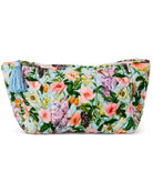 The beauty bag everyone loves. Our best-selling quilted velvet toiletry bag is back to carry your everyday bits in cushy, velvety style. Soft to touch, bold to behold, and roomy enough for your daily must-haves, this bag is proof that practical can also be seriously pretty. The Spring In The Air Velvet Toiletry Bag features soft blue velvet covered with cheerful springtime florals and fresh fruits with pale blue tassel zip. Pair with matching Spring In The Air Velvet Cosmetics Purse for a dream team beauty duo.