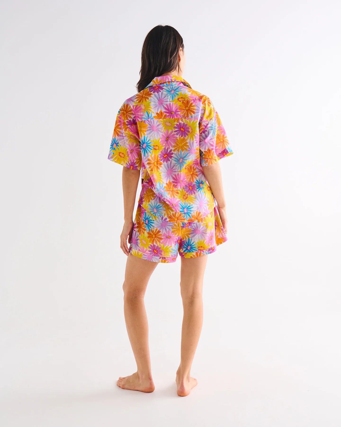 Float through summer nights in the Petal Power Adult Organic Cotton Short Sleeve Shirt & Short Pyjama Set. Cut from ultra lightweight organic cotton voile that’s soft, breathable, and effortless to wear, this set is all about easy comfort. With a short sleeve button-up shirt paired with relaxed elastic waist shorts, they're your perfect plus-one for dreamy sleep-ins and lazy summer lounging. Our Petal Power print is a floral dreamland, with painted daisies in yellow, pink, blue and purple.
