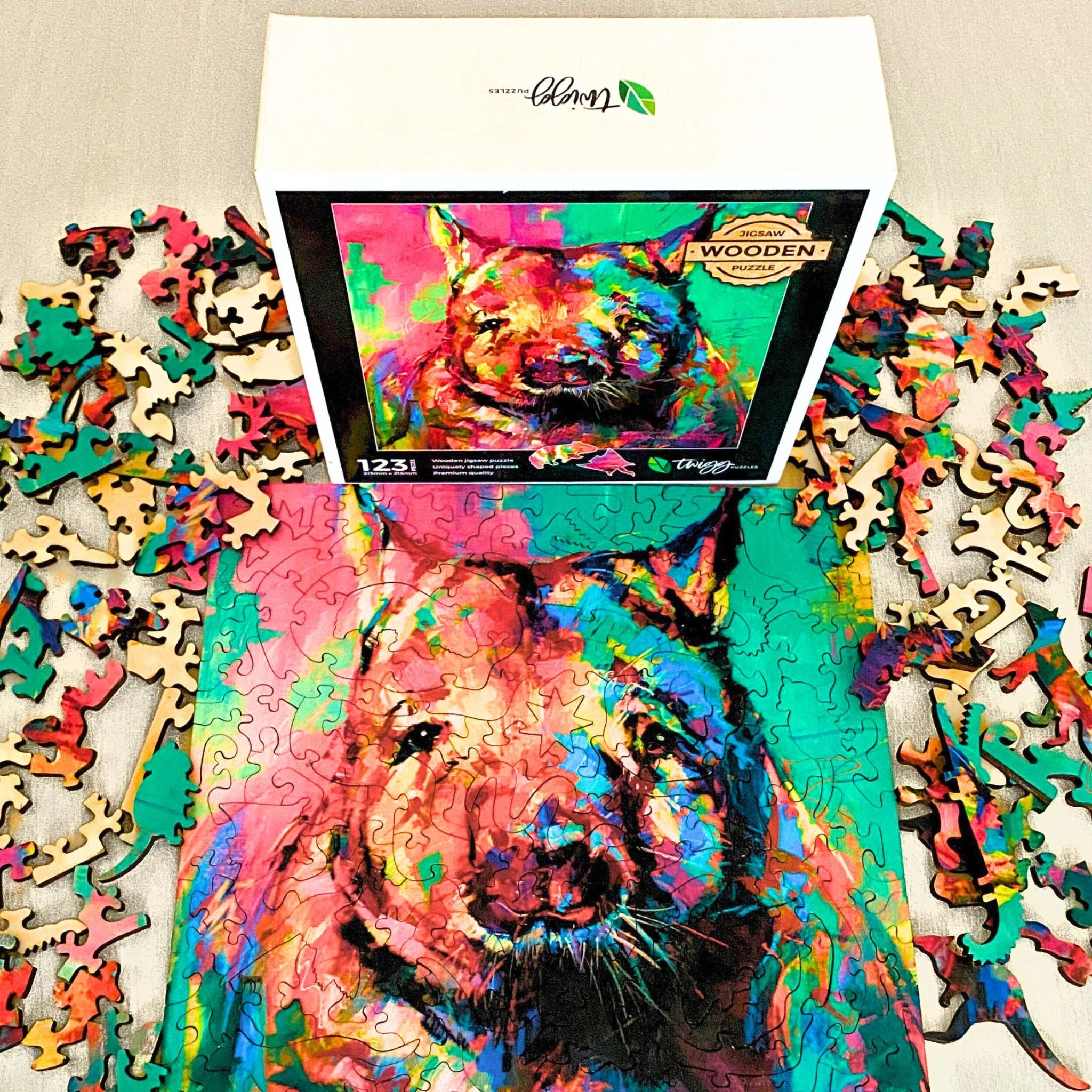 This is another original artwork from artist Jos Coufreur. This little wombat has been a requested image for a while now. The interesting part of this puzzle is the way that the pieces develop into shapes of little burrows. Just as a wombat has his burrows. A delight to find flying foxes, dingo's, crocodiles, wombats, snakes and more...