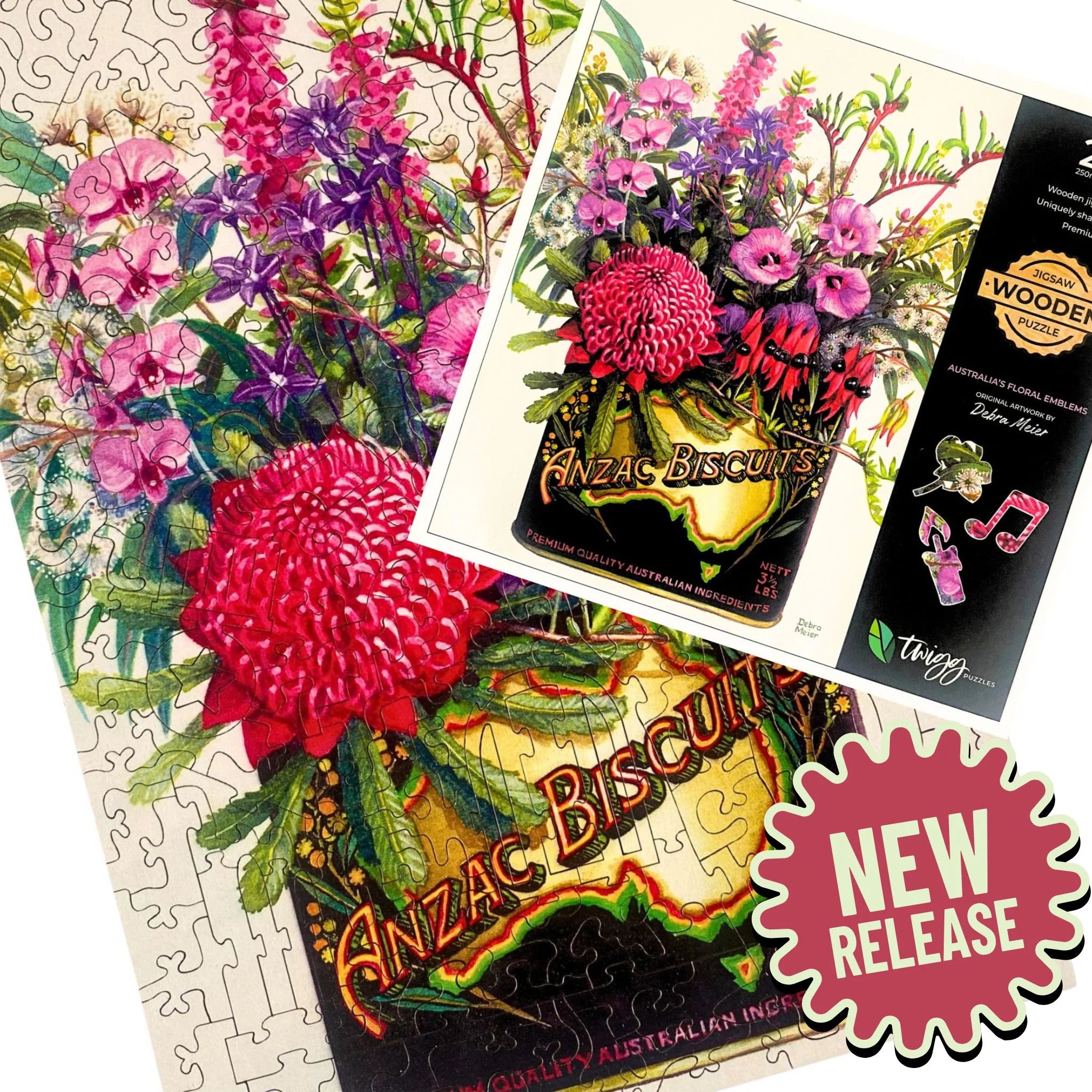 This is original artwork from Debra Meier and is her watercolour tribute to all of Australia’s floral emblems of our nation’s different states and territories in a Vintage Anzac Biscuits Tin.