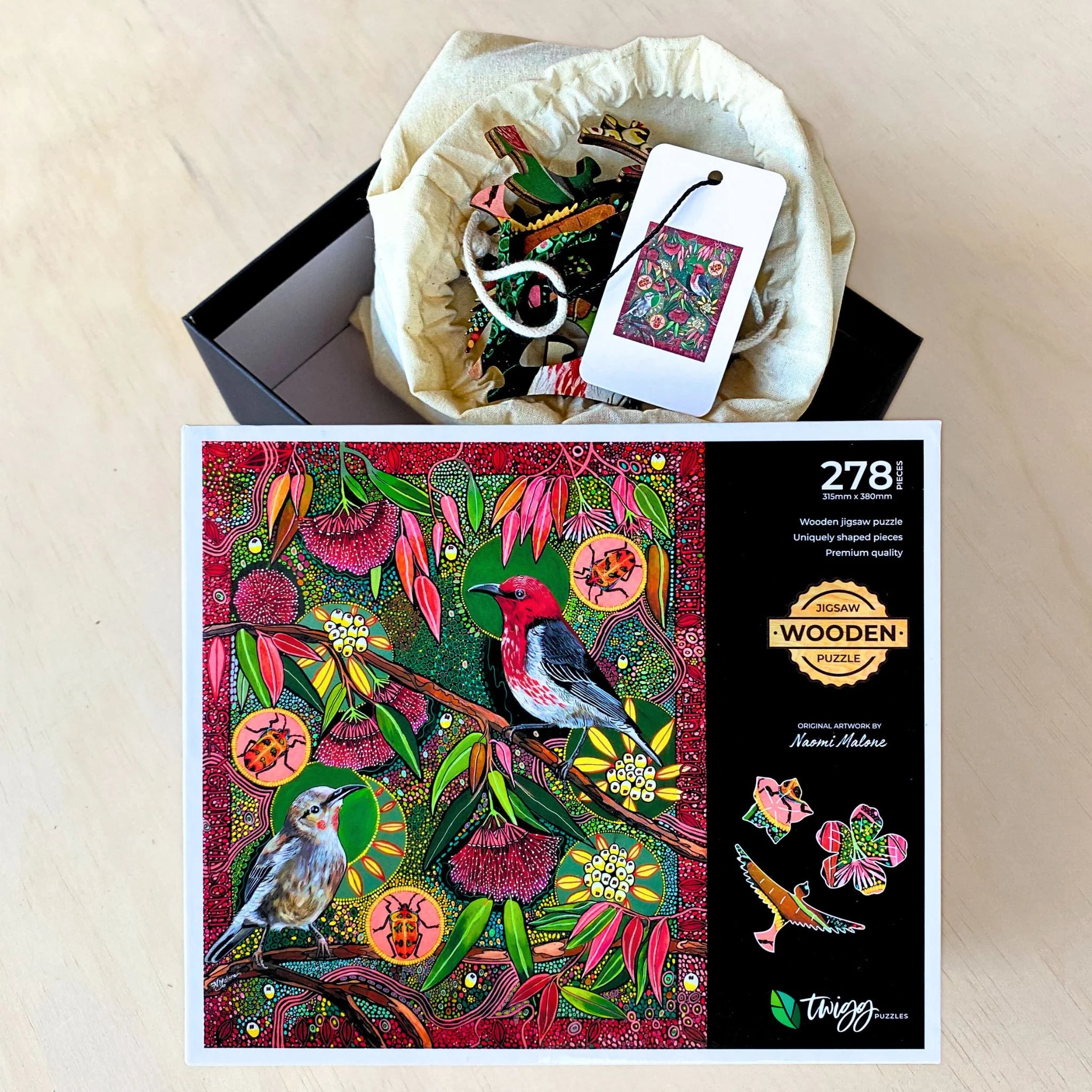 We are so excited to introduce a new artist to the collection. This is original artwork from Naomi Malone. The pieces are intricately shaped and feature the theme of nature. Featuring the Powderpuff Lilly Pilly with their gorgeous fluffy flowers and bright pink new growth leaves.