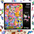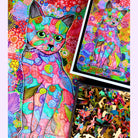 This wooden jigsaw puzzle is a beautiful piece of art from a Spanish artist Noemi Ibarz. This jigsaw puzzle is a handpainted cat and is not only vibrant, colourful and beautiful, but it also celebrates all things CATS. The puzzle piece shapes are of various cat positions, fish bowls, feathers, 9 lives, milk bottles and so much more.