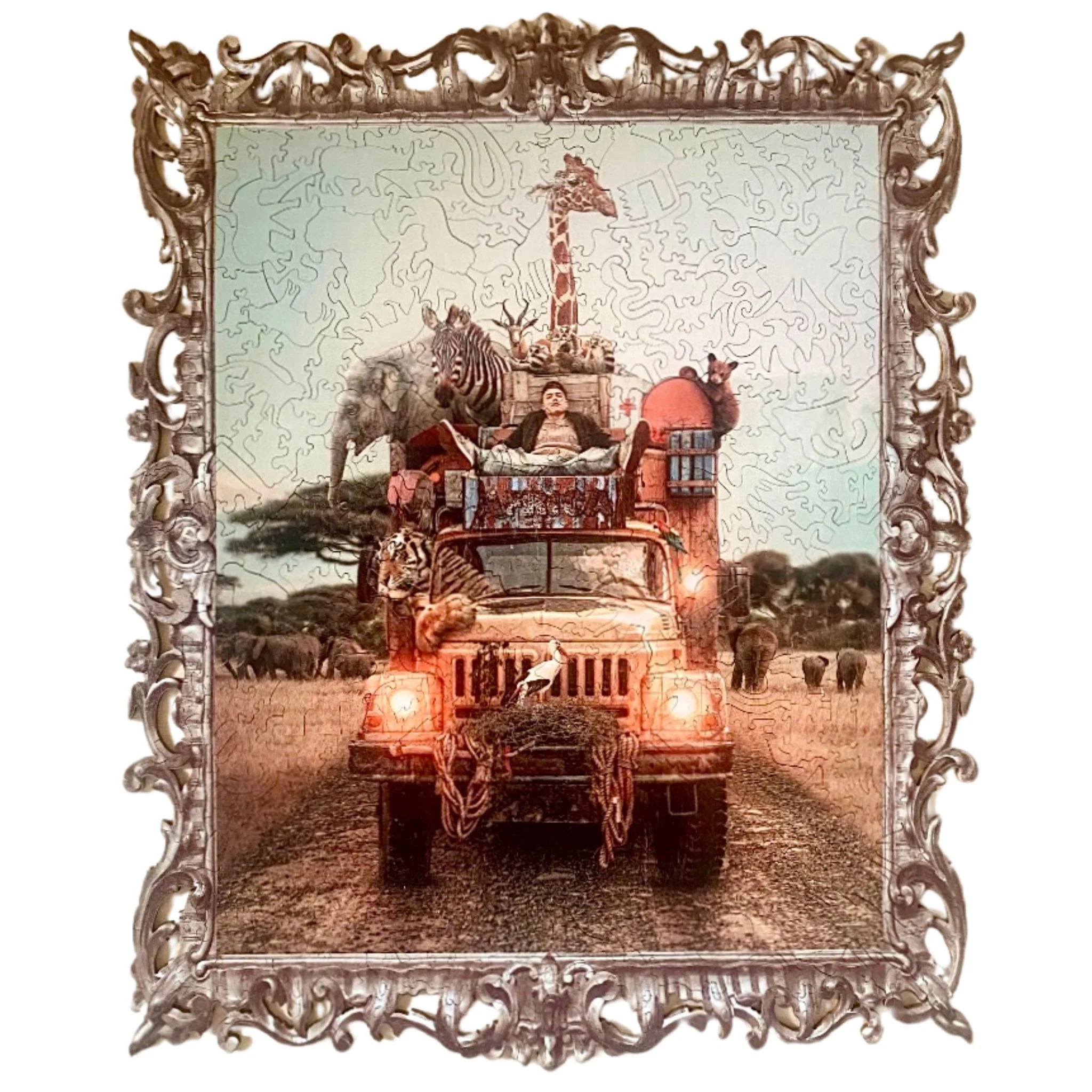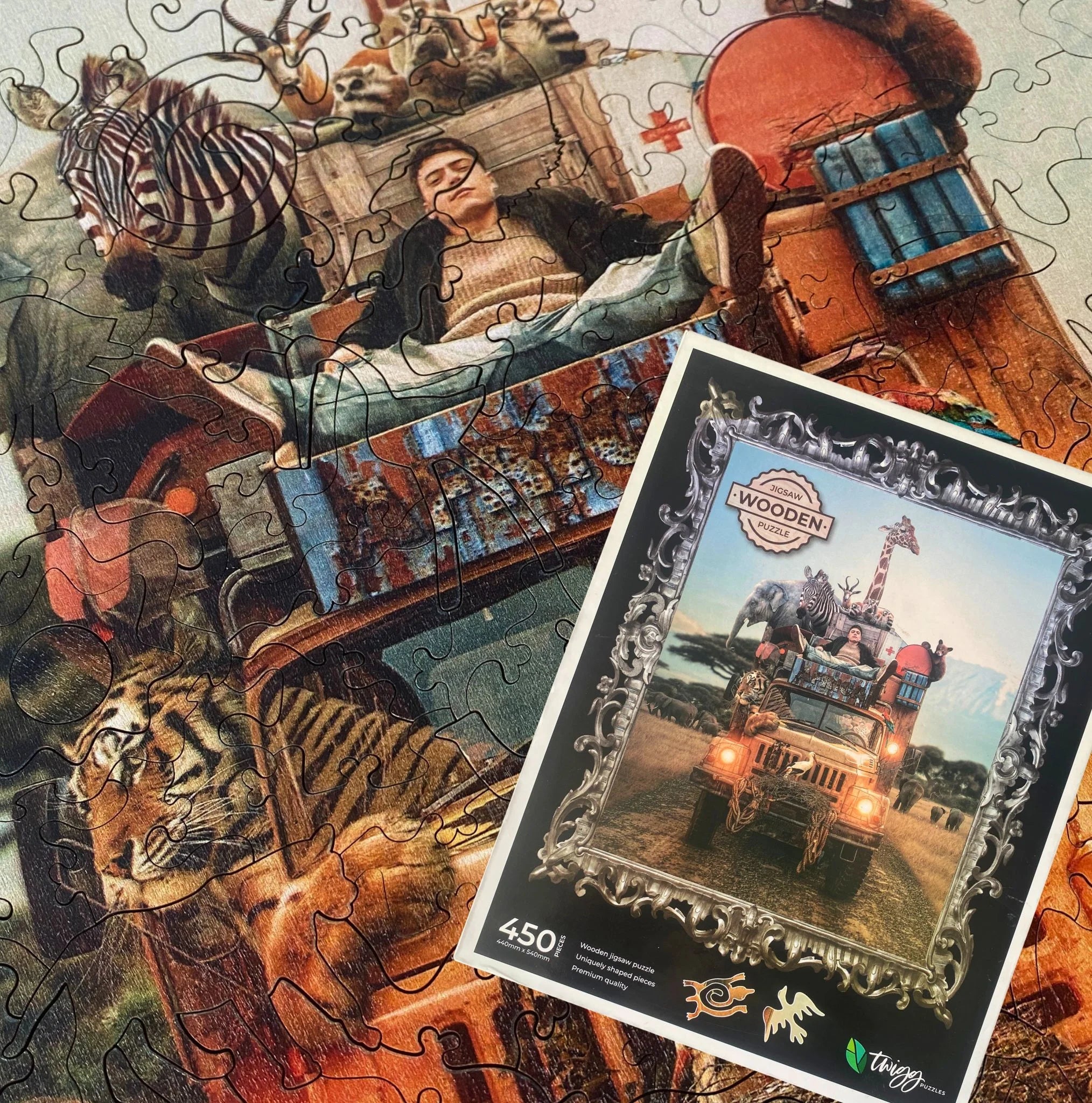 The photos do not do this wooden jigsaw puzzle justice, you have to build that frame that surrounds the image (how cool is that)! This is now the second largest puzzle in our range and is the first of a kind from our creations. We really stepped out of our comfort zone with this one and loved how it turned out. The image is from a photoshop artist and hence the ability to create such an interesting and unique piece. The puzzle is filled with all things African and tribal and you will not want to step away from the table once you have started this one.  It is a challenging puzzle at 450 pieces, but oh so worth it!